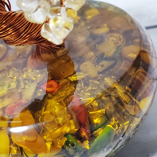 当店のオルゴナイトアーティストのニョマン氏の弟であるクトゥ氏が、日本の盆栽をイメージして創ったパワーストーンツリー作品に、ニョマン氏がオルゴナイトで基底部を加えたオルゴナイトパワーツリー作品です。