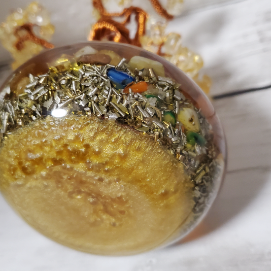 この商品は、オルゴナイトというパワーストーンや金属を樹脂で固めた特殊な素材で作られています。