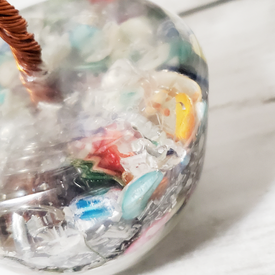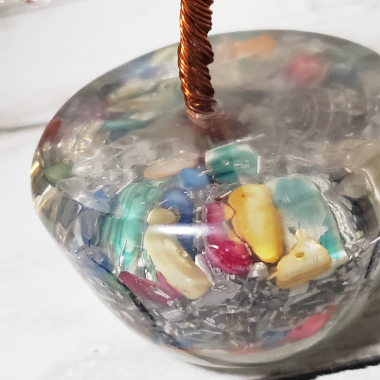 【銅線コイル】に巻かれたカラフルな【シーシェルパウダー(貝殻の粉)】の練りこまれた樹脂製オブジェも不思議なエネルギーを感じさせます。